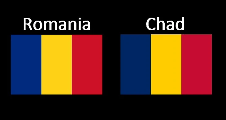Отдельный случай между Румынией и Чадом. Уже известно, что Чад НЕ сыграет на мундиале, однако и здесь не обошлось без конфуза. В Румынии и Молдавии то и дело ведутся дискуссии об объединении, но здесь мешает Приднестровье, которое выступает против этого. Зато флаги обоих государств фактически идентичны друг другу. Чад кутежа с цыганским оттенком! )))) Отличие есть хотя бы не только в столицах (Нджамена и Бухарест), но и в языках: в одной из беднейших африканских стран официальный язык - французский.