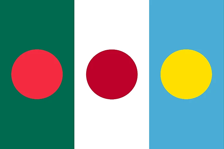 Япония традиционно считается Страной Восходящего Солнца. «Как бы не так», - подумали в Бангладеше и вывесили свой флаг. Пришлось, правда, закрасить белый фон зеленым цветом. «Мы можем еще лучше», - решили в Палау и сделали солнце желтым, а небо - лазурным. Утренней свежестью повеяло на Корейском полуострове.