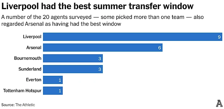 Издание The Athletic выяснило, как футбольные агенты оценивают прошедшее летнее трансферное окно в Премьер-лиге. Журналисты опросили 20 агентов, каждому было предложено ответить на несколько вопросов, касающихся летних сделок английских клубов.