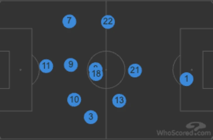 Диаграмма усреднённых позиций не всегда отражает реальность, но даже она показывает: никакой «устаревшей 4-2-4», о которой писала вся итальянская пресса, на самом деле не было. На начальной стадии розыгрыша мяча Италия выстраивалась с тройкой защитников: Ди Лоренцо оставался сзади вместе с Бастони и Калафьори, что позволяло создавать численное преимущество и контролировать прессинг соперника.