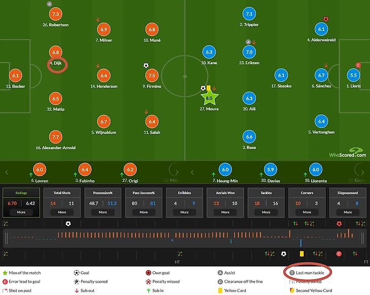 Ван Дайк одновременно перекрывал передачу на Сона и не пускал Сиссоко под сильную ногу. В итоге он вынудил его убрать мяч под левую ногу и сместился, максимально затруднив удар.