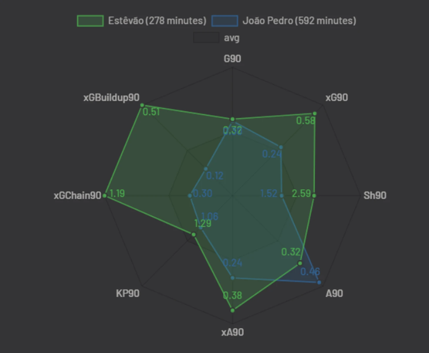 Если посмотреть на сравнительную статистику Эстевао и Жоао Педро в АПЛ 25/26 (на момент 14 октября 2025 года), то можно увидеть, что Эстевао превосходит Жоао Педро по многим атакующим показателям, что не может не впечатлять. Но нужно сделать оговорку: Эстевао провел на поле меньше времени (278 против 592 минут) и часто выходит на замену под уставших соперников, поэтому в таком контексте намного проще создавать угрозу у чужих ворот.