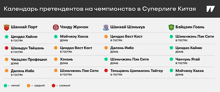 ● У трех главных претендентов на чемпионство схожий календарь: по простому сопернику из низа таблицы и еще несколько потруднее. Двум предстоят выездные игры с непростым «Циндао Вест Кост», «Чэнду» и «Шэньхуа» на финише будут вскрывать борющийся за выживание «Шэньчжэнь».