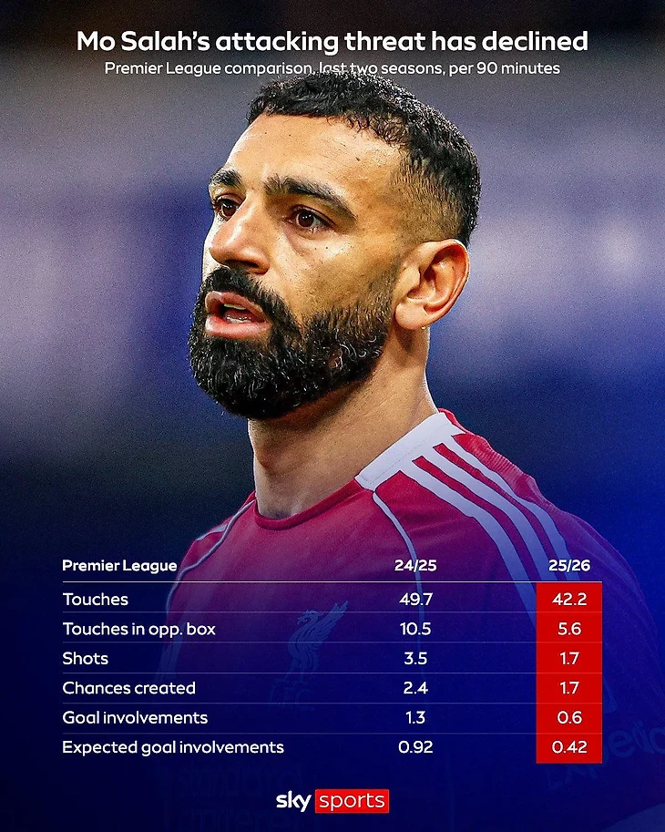 Британский Sky Sports покопался в статистике за прошлый год и за этот, и наглядно через инфографику показал, что египтянин просел буквально во всех атакующих показателях.