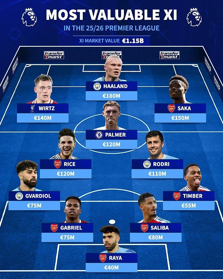 От «Манчестер Сити» в списке оказались Йошко Гвардиол, Родри и Эрлинг Холанд — норвежец сохраняет статус самого дорогого футболиста Премьер-лиги с оценкой в 180 миллионов евро. Компанию им составляют Коул Палмер из «Челси» и Флориан Вирц из «Ливерпуля».