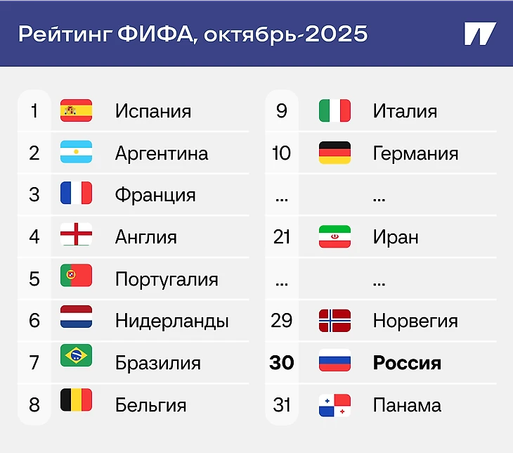 ● Россия выше многих крепких сборных, причем некоторые из них уже обеспечили себе ЧМ-2026. Например, эти команды идут ниже: Египет (32), Польша (33), Уэльс (34), Алжир (35), Сербия (36), Венгрия (37), Нигерия (41), Кот-д’Ивуар (42), Чехия (44).