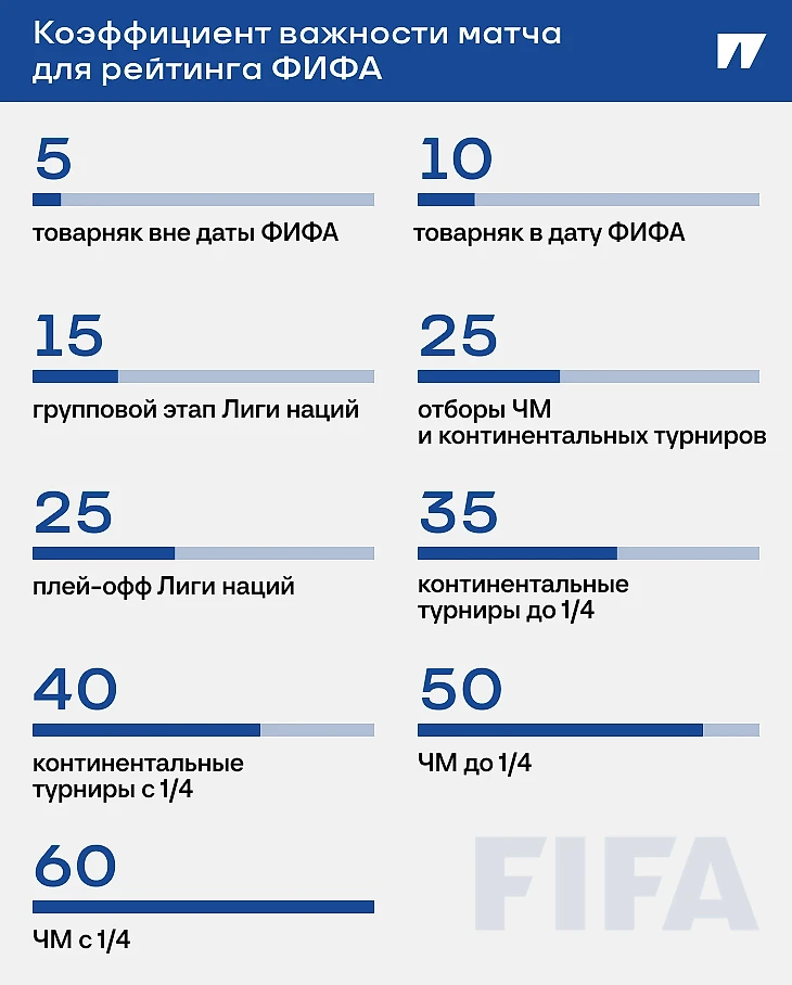 I – коэффициент матча (например, 5 для товарищеских матчей вне окон ФИФА, 10 – за товарищеский матч в окно, остальную разбивку дадим ниже)