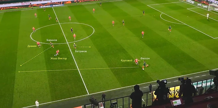А дальше Батраков не бежал на максималке в штрафную, а двигался так, что остался один: Матвей Кисляк и Иван Обляков как раз бежали спасать, Жоао Виктор возвращался в свою номинальную позицию. Несколько идеальных действий от Батракова в одной атаке».