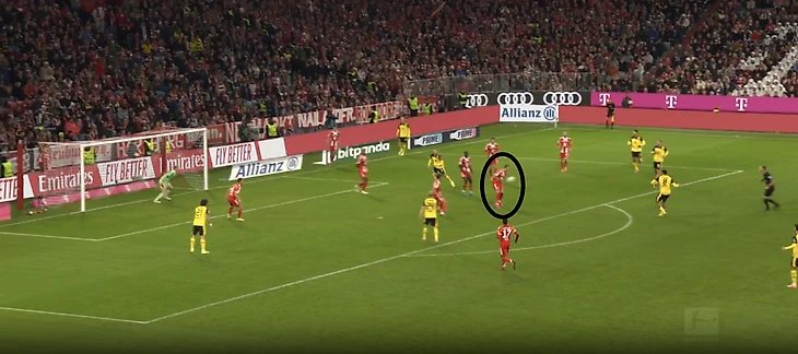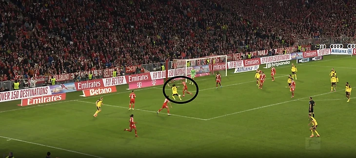 Такая расстановка, где в роли страхующего – не Антон, а Шлоттербек – сделала оборону «Дортмунда» заметно агрессивнее. Не сосчитать, сколько раз Шлоттербек (и партнеры рядом) перекусывали длинные передачи «Баварии» в стиле Упамекано до перерыва.