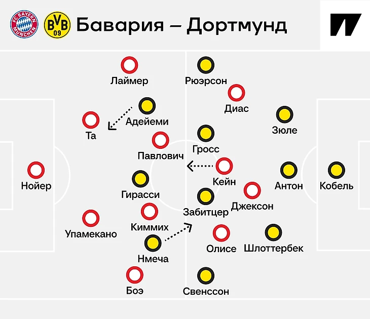 «Дортмунд» подготовил пару сюрпризов. Первый – выход Никласа Зюле, а не Рами Бенсебайни, одного из лучших игроков «Боруссии» на старте сезона (был не готов на 100% после матчей сборных). Второй – необычная гибридная позиция Феликса Нмечи, который был то третьим полузащитником, то третьим нападающим. Обычно Нмеча действует в паре с Марселем Забитцером, здесь рядом с австрийцем появился Паскаль Гросс. Оборонительный выбор Нико Ковача.
