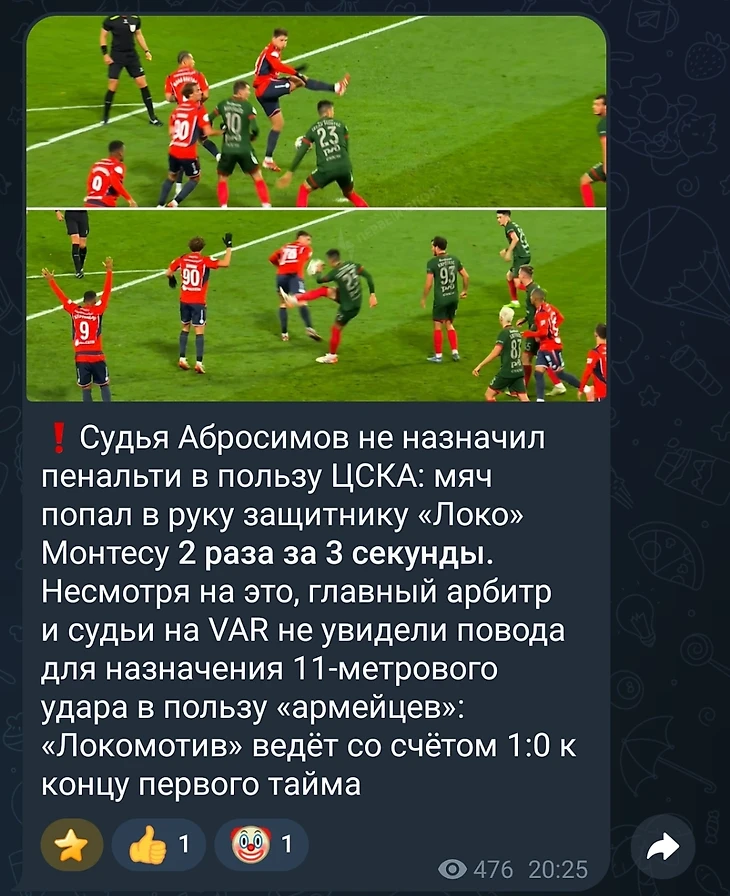 В субботу «Локомотив» в домашнем матче 12‑го тура МИР РПЛ обыграл ЦСКА со счетом 3:0. На 32‑й минуте мяч дважды попал в руку Монтеса, но арбитр Иван Абросимов не назначил пенальти в ворота железнодорожников.