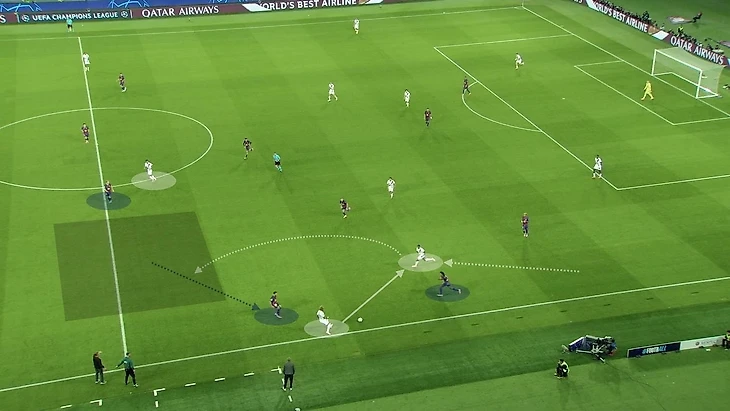 Первый гол «ПСЖ» в матче с «Барселоной» – наглядный пример того, как можно использовать большое расстояние между крайними защитниками «Барсы» и их визави по флангу.