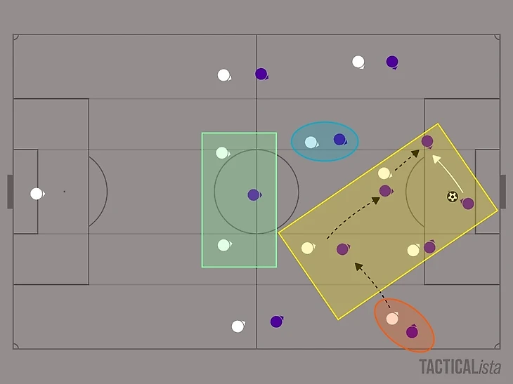 Использование двойной ширины создало пространство между левым и правым защитником, которое было использовано за счет вингера, освободившегося и сделавшего скидку на набегающего в центр игрока.