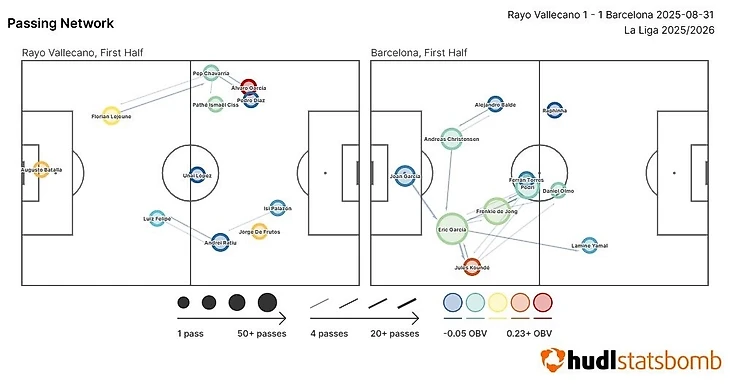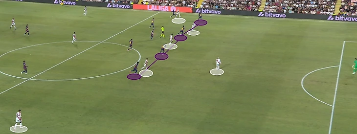 Но тренер «Райо» не ограничился желанием сдержать продвижение мяча «Барсы» – он совместил прессинг-план с точечными решениями при игре с мячом, бьющими по всем слабым сторонам «Барселоны» в обороне.