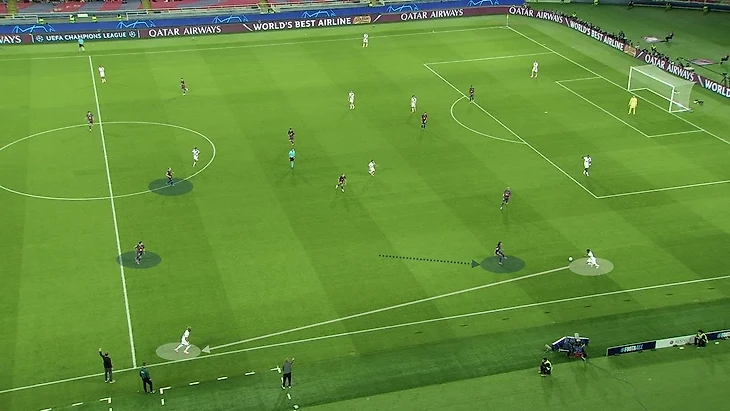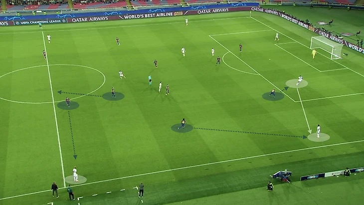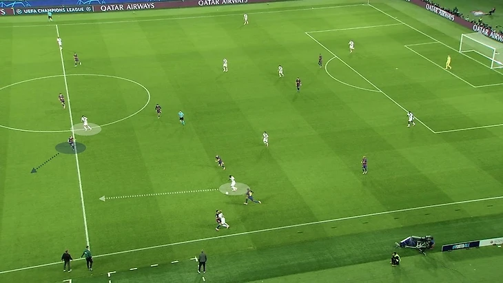 Еще одним важным нюансом стал факт рывков из глубины сразу двух и более игроков – это ломало построение обороны «Барсы». Защитники не могут «держать линию» по нескольким футболистам, они делают это только по одному игроку – рывок двух или более соперников за спину сбивает их с толка.