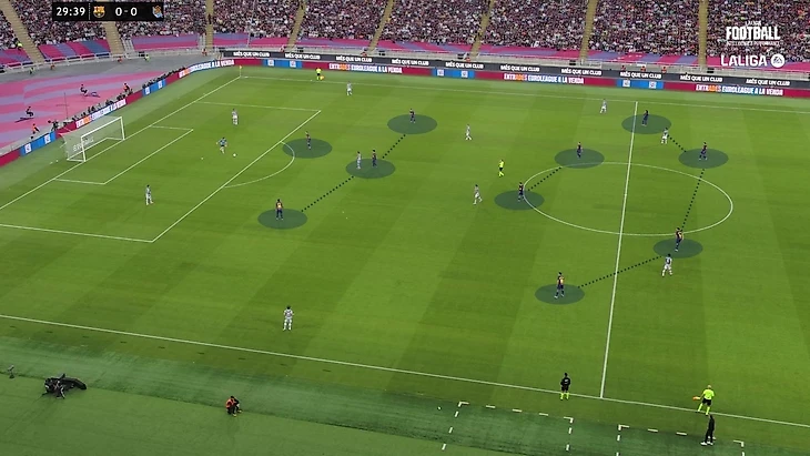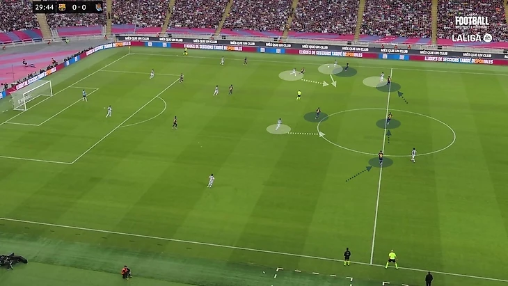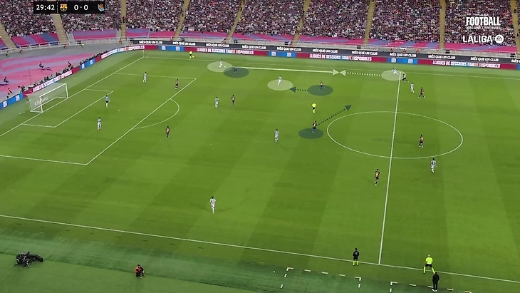 «Сосьедад» намеренно использовал фланги, чтобы создавать пространство и вскрывать оборону «Барселоны» через взаимодействия в этих зонах.