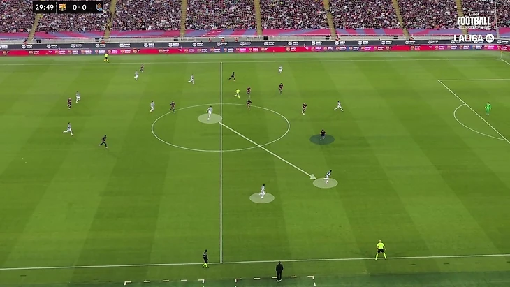 ● Персональный прессинг с акцентом на изоляцию тройки полузащитников соперника: Тчуамени возьмет на себя Фермина, Вальверде будет играть по Де Йонгу, а Беллингем по Педри.