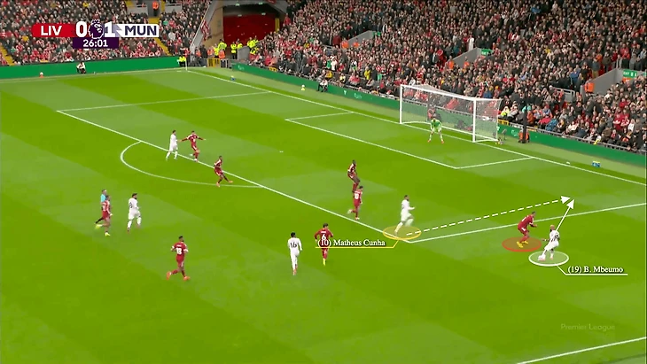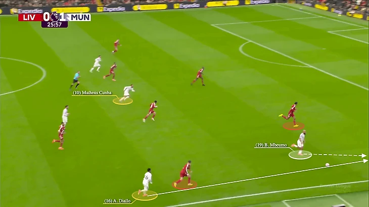 Длинные передачи Ламменса направлялись на центрального нападающего «Юнайтед», противостоявшего Ибраима Конате и Собослаи, в то время как Кунья, переместившийся на левый фланг в роли «десятки», ожидал возможности атаковать второй мяч.