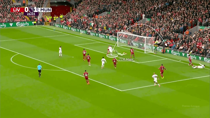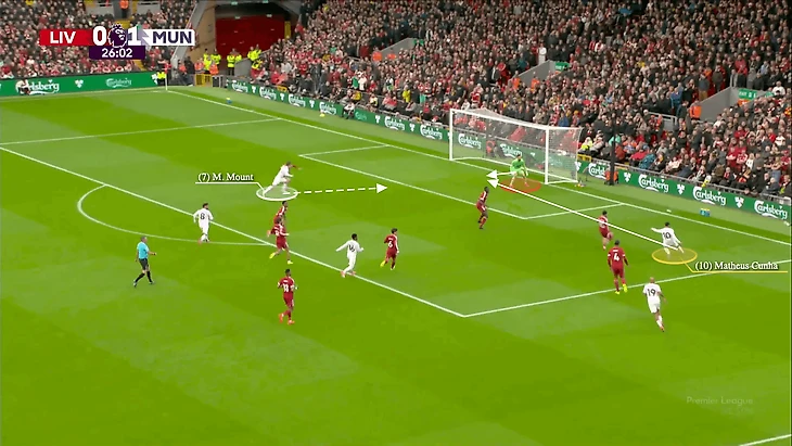 В атаке, приведшей к тому угловому, Шешко быстро сыграл в стенку с Фернандешем за спинами полузащитников «Ливерпуля», после чего Кунья рывком атаковал пространство за Конате и Собослаи, которые оба были сосредоточены на центральном нападающем «Юнайтед».