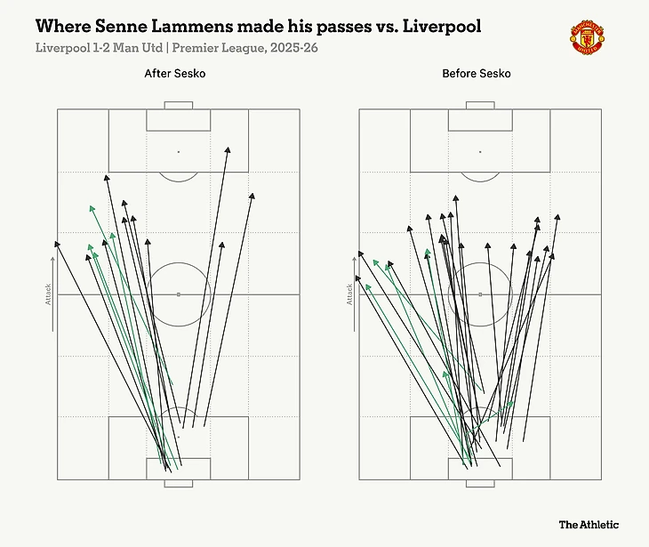 Однако показатель, лучше всего отражающий характер матча и подход «Юнайтед», — это 45 длинных передач Сене Ламменса (определяемых как передачи длиной не менее 32 метров, или 35 ярдов). Количество длинных передач, выполненных Ламменсом против «Ливерпуля» в воскресенье, стало самым большим показателем для вратаря Премьер-лиги за один матч с начала прошлого сезона.