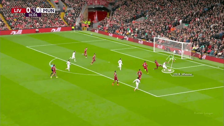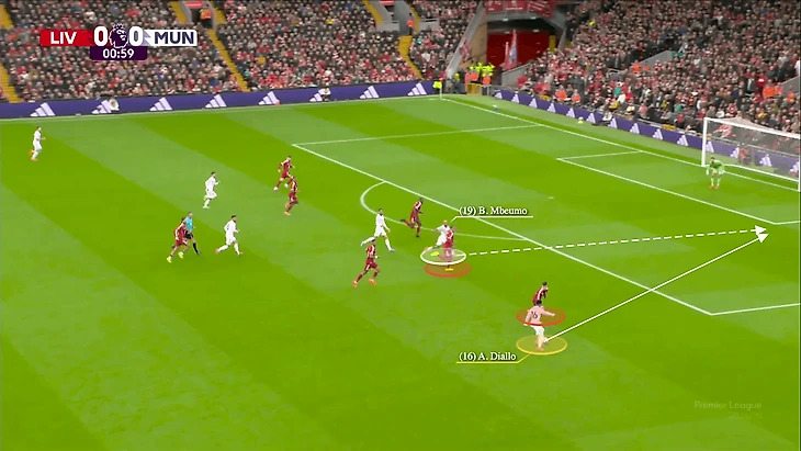 Пространство и время, которые получает Амад с мячом, позволяют ему отдать передачу на рывок Мбемо за спину Ван Дейку — который уже возвращается в позицию, — и форвард забивает, открывая счёт 1:0.
