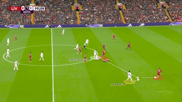 Во время этих верховых дуэлей Керкез сохраняет дистанцию от Амада, чтобы иметь возможность защитить пространство за спиной Ван Дейка. Когда Фернандеш выигрывает второй мяч, он переводит его на правого вингбэка «Юнайтед», чтобы использовать это преимущество.