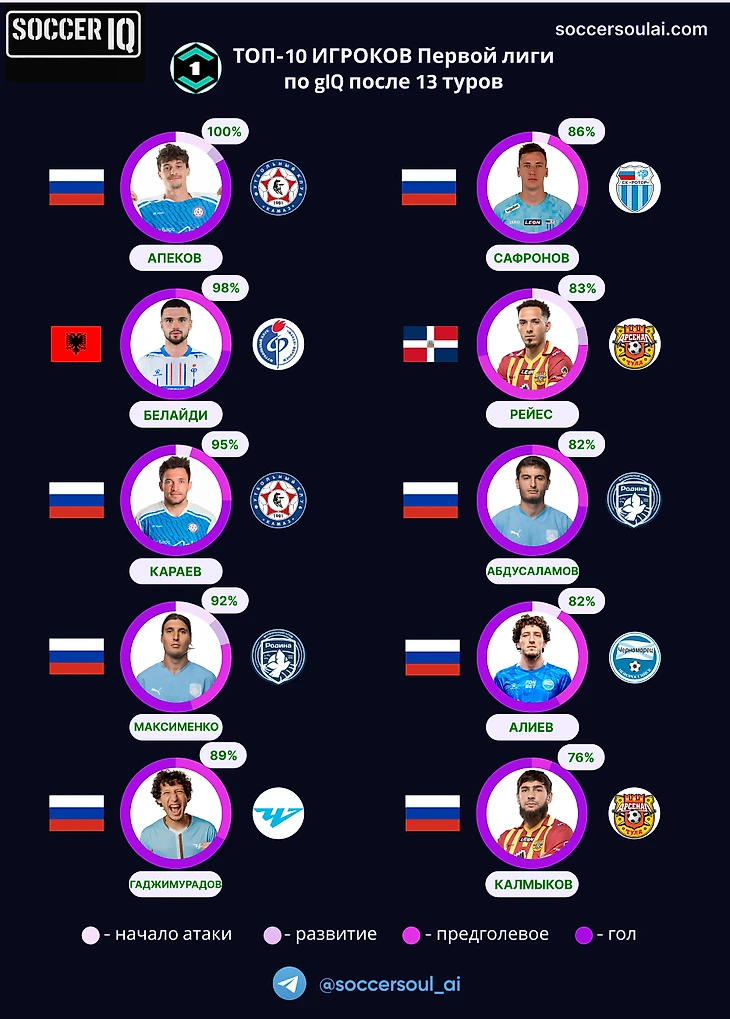 Замыкает ТОП-10 Амур Калмыков – игрок, имеющий в подборке наибольшую долю gIQ в фазе завершения (94%, что отображает цветовая гамма по окружности). Наибольшая доля предголевых действий (голевая передача или предударный финт) на счету Рейес (46%). Он же – лучший с точки зрения доли начала голевых атак (20%)!