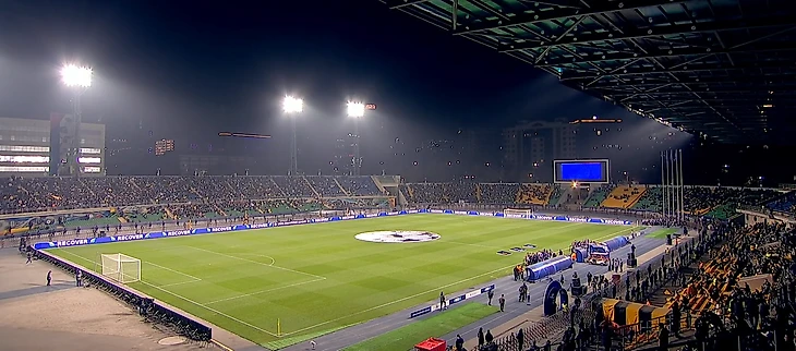А вот так выглядел общий план стадиона перед началом игры. Очевидно, что есть свободные места даже на 23-тысячной арене, хотя это всего второй домашний матч клуба в истории ЛЧ.