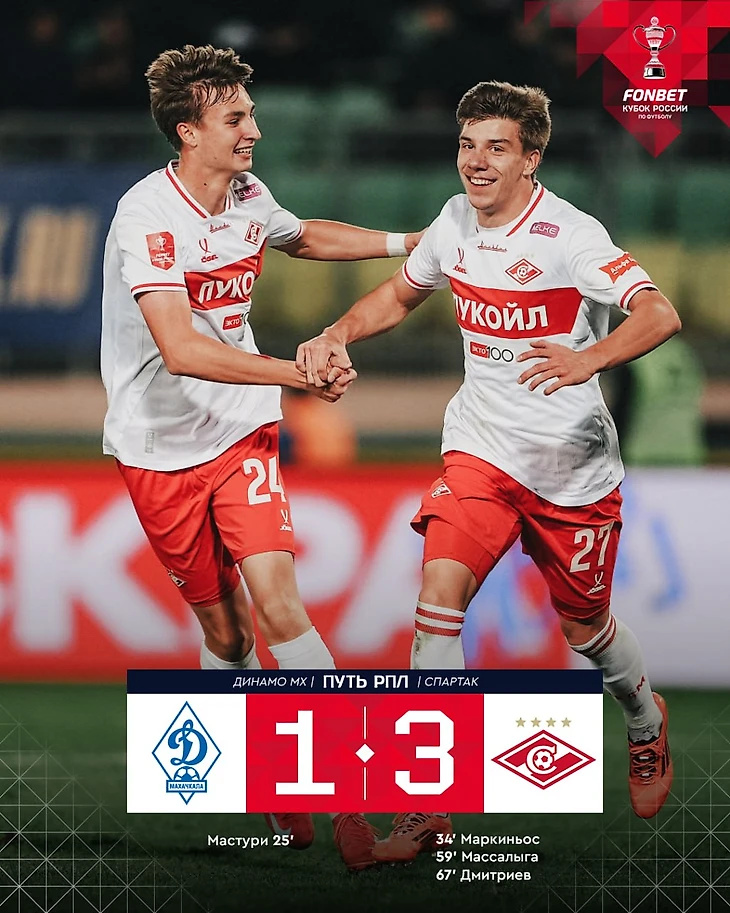 «Спартак» на выезде победил махачкалинское «Динамо» в матче 6-го тура группового турнира пути РПЛ FONBET Кубка России — 3:1.