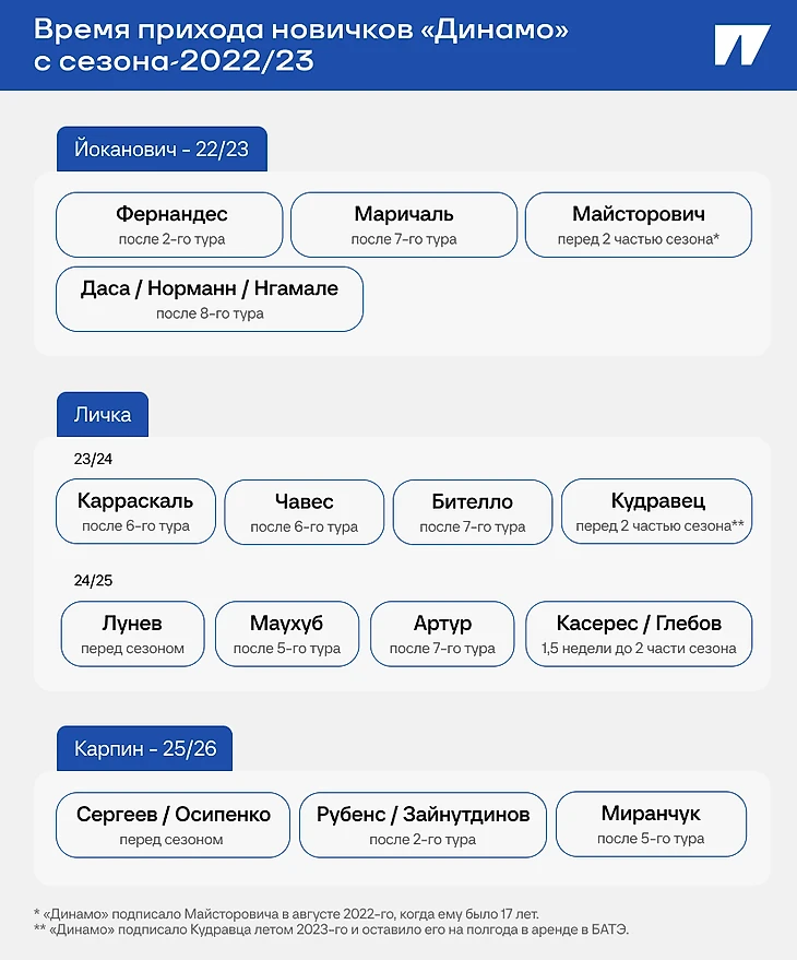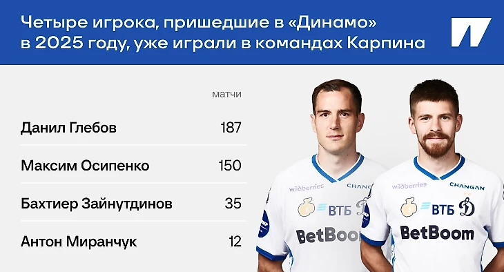 Хоть прямой связи между приходами Осипенко и Карпина нет, невозможно не воспринимать Максима как одного из воплотителей тренерских идей в новой команде. «Одного из» – потому что три из четырех новичков «Динамо» летом 2025-го уже работали с Карпиным либо в «Ростове», либо в сборной России. Кроме того, еще в феврале 2025-го из «Ростова» в «Динамо» перешел Данил Глебов – лидер по количеству матчей под руководством тренера Карпина.
