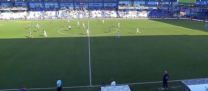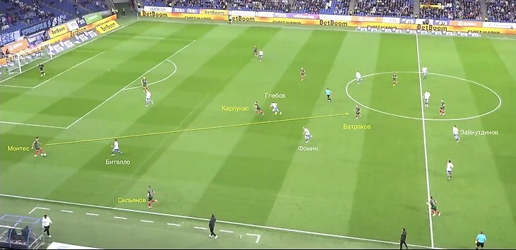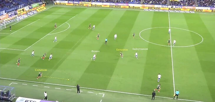 Батраков в два касания отдал пас на Сильянова во фланг – Фомин оказался отыгранным, реагируя на мяч.