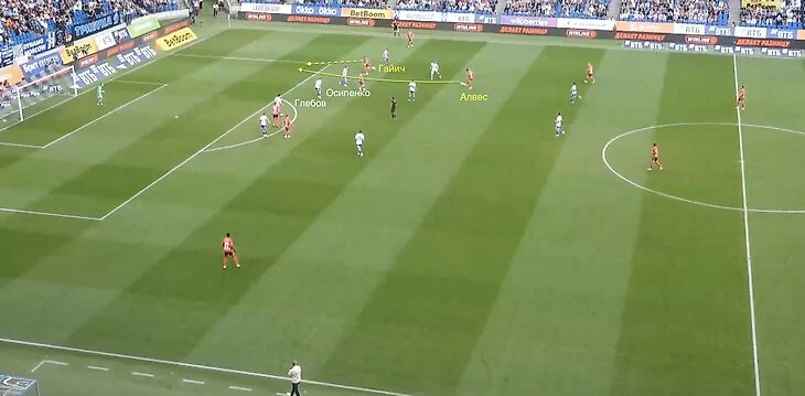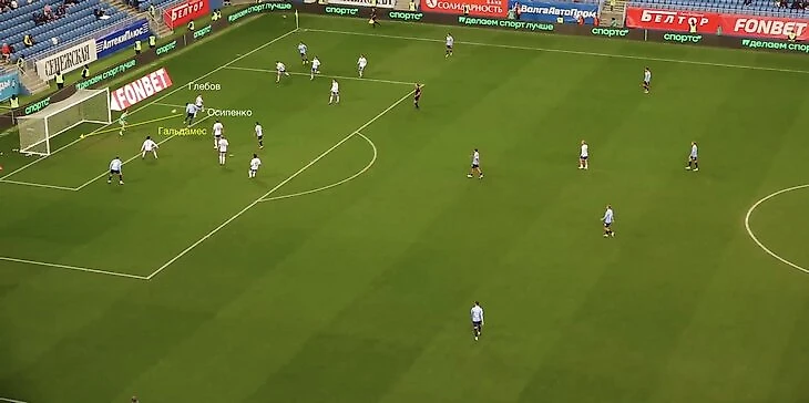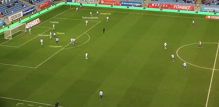 В штрафной Осипенко играл по Джимми Марину, а Томас Гальдамес был один нескольких секунд. Ахметов перебросил Глебова, располагавшегося на ближнем углу вратарской, а Осипенко даже в последний момент не переключился на одинокого Гальдамеса.