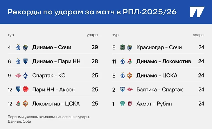 После 12-го тура «Динамо» бьет не то что много, – оно вообще лидирует по ударам за матч (16,6, у «Краснодара» – 16). По xG без пенальти у «Динамо» тоже первое место (1,7 за матч, у «Краснодара» – 1,55). Среди десяти лучших результатов сезона по ударам за матч четыре – динамовские, у других команд в этом списке – не больше одной игры.