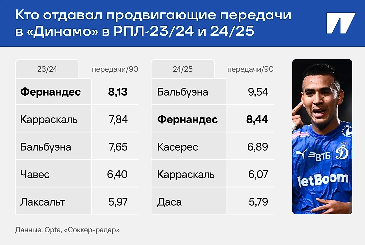 В обоих сезонах при Личке Фернандес входил в топ-2 игроков «Динамо» по продвигающим передачам за 90 минут (включая показатели в матчах, которые Роберто провел на левом фланге обороны в РПЛ-2024/25).