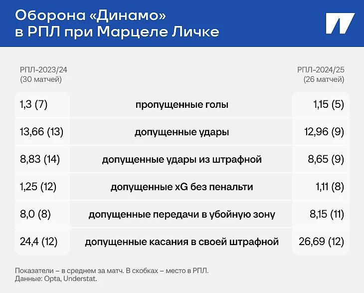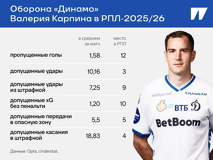 Слова Пивоварова отчасти соответствуют действительности: в среднем за матч «Динамо» допускает 10,2 удара, это третий результат в РПЛ после «Краснодара» (8,8) и «Ростова» (9,9). Количество допущенных передач в убойную зону и допущенных касаний в своей штрафной тоже не катастрофично – пятое и четвертое место в лиге.