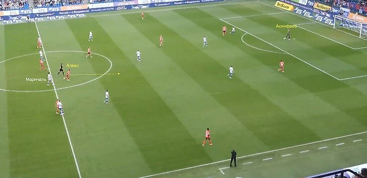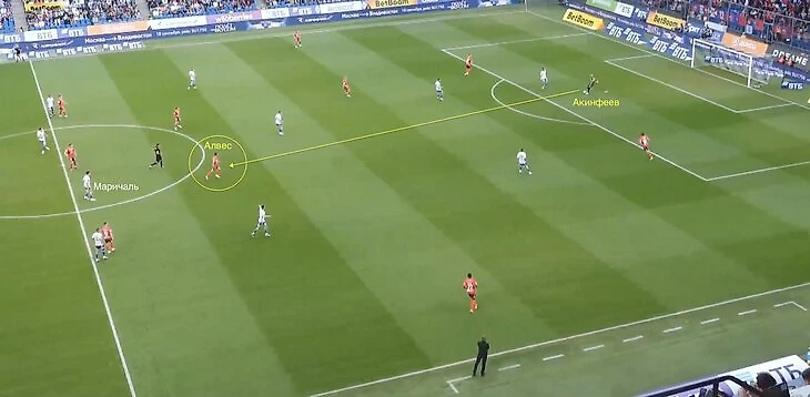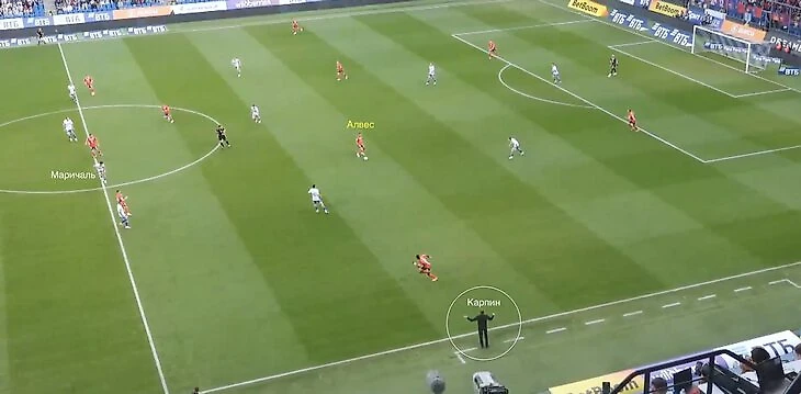 Когда мяч оказался у Акинфеева, Матеус Алвес начал движение в глубину, открываясь под передачу. При требованиях Карпина в таких ситуациях центральный защитник обязан доигрывать за соперником, но Маричаль остановился на центральной линии.