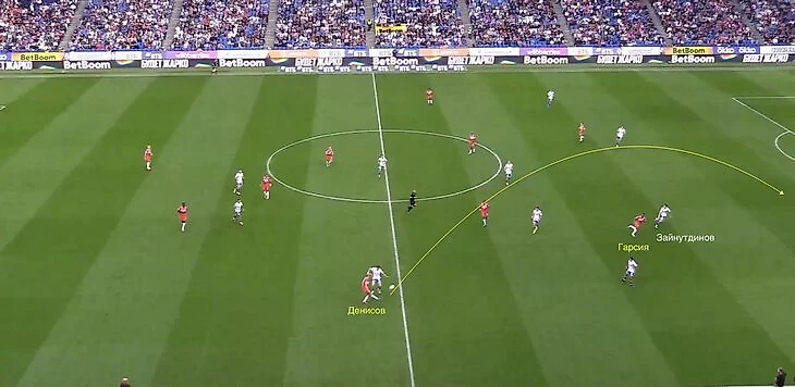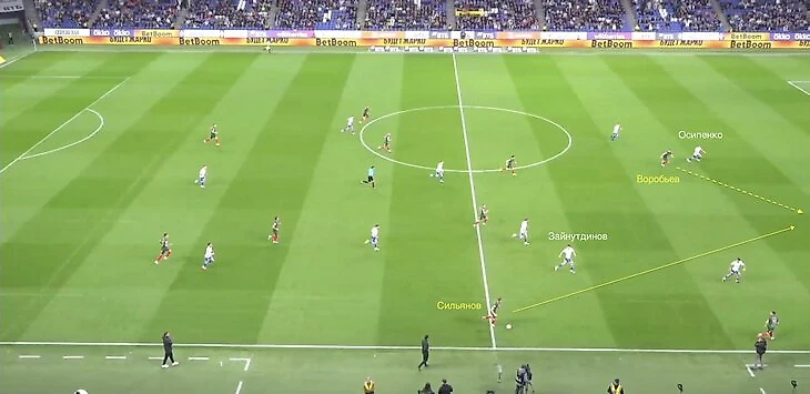 Сильянов продвинулся до центральной линии и отдал пас на Воробьева, который ворвался в зону, оставленную Зайнутдиновым.