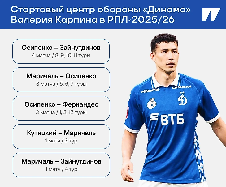 И это решение Карпина нельзя назвать вынужденным: во всех четырех матчах в запасе «Динамо» сидели профильные центральные защитники Маричаль и Фернандес. Сослаться на последствия травм этих игроков не получится: Маричаль вылетал вообще во втором туре («Спартак» был в восьмом), а Фернандес вернулся в заявку еще в шестом.