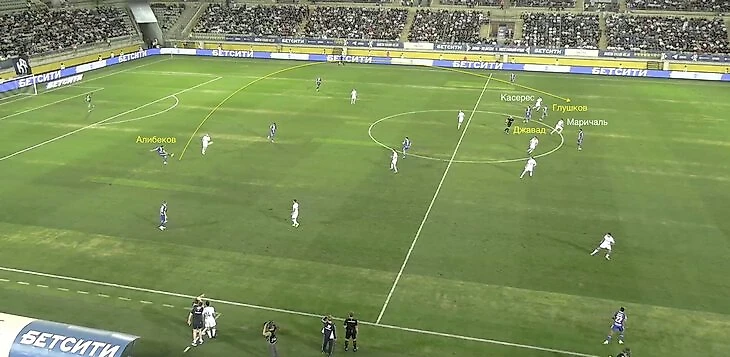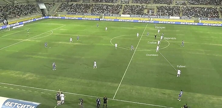 В этот момент четыре атакующих игрока ЦСКА (Круговой, Мусаев, Матеус Алвес, Глебов) находились на центральной линии поля против четырех защитников «Динамо» (Рубенс, Осипенко, Маричаль, Касерес). Игра 1-в-1 – все, как любит Карпин.