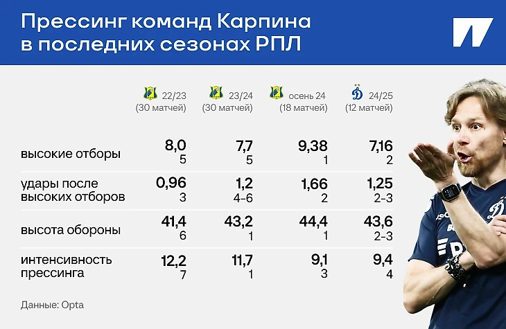 В последние полтора сезона при Карпине у «Ростова» была самая высокая линия обороны в лиге. «В «Ростов» приходили футболисты, которые не были готовы играть в тот футбол, который мы требовали. Через год они в него играли. Если футболисты захотят и смогут, то будут это делать», – говорил тренер на первой пресс-конференции в «Динамо».