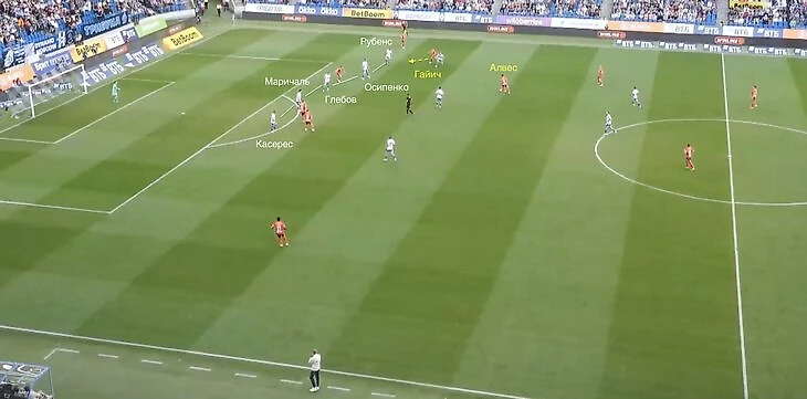 Матеуса Алвеса никто не атакует, и вся оборона «Динамо» смотрит на мяч. Осипенко пропускает включение Милана Гайича за спину.