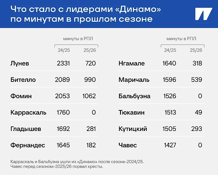 Из двенадцати игроков, которые отыграли больше всего в прошлом сезоне, только один провел больше тысячи минут в этом – это Даниил Фомин. Карраскаль и Бальбуэна ушли, Чавес порвал кресты, Тюкавин восстанавливался после них.