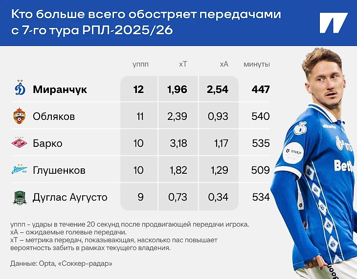 С седьмого тура (то есть дебюта Миранчука в старте «Динамо») никто не создавал больше явных моментов, чем Антон: 5 (у Алексея Батракова – 3). По другим продвинутым метрикам, в том числе xT (показывает, насколько пас повышает вероятность забить в рамках текущего владения, то есть до потери мяча или завершения атаки), Миранчук тоже либо лучший игрок РПЛ, либо входит в топ-3 на отрезке с конца августа.