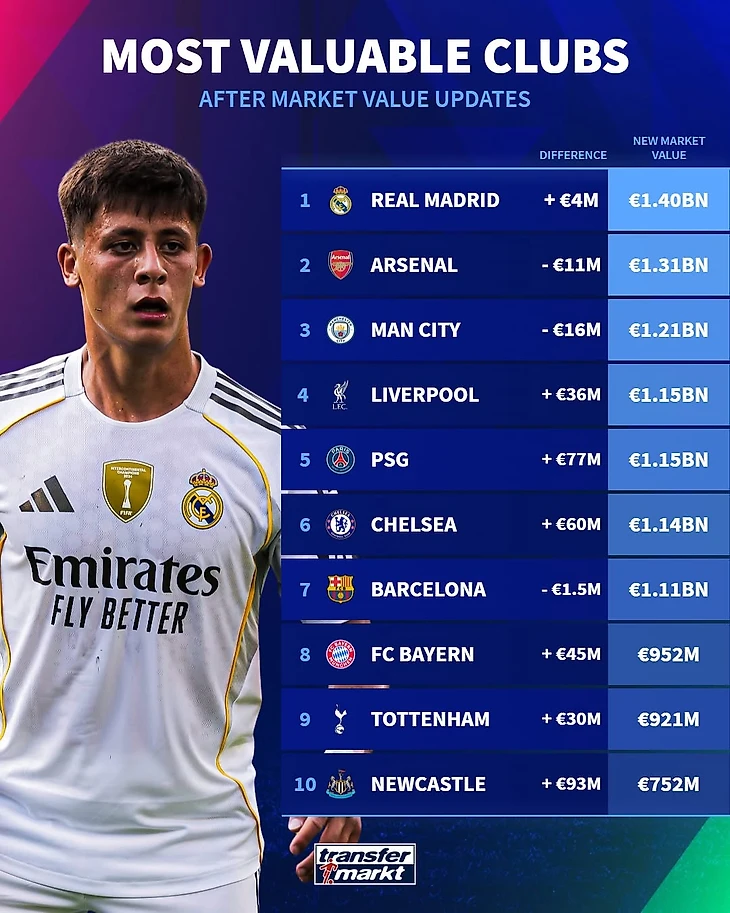 Самым дорогим клубом мира остается «Мадрид», за всех игроков которого придется выложить 1,40 миллиарда евро. «Сливочные» увеличили суммарную стоимость состава лишь на 4 млн евро. Самый большой рост показал Франко Мастантуоно, подорожавший на 20 млн евро, в общем клубном зачете этот результат обнулил Винисиус, который потерял в цене те же 20 млн.
