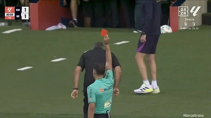 Ханси Флик получил красную карточку на 91-й минуте матча против «Жироны» (2:1) – арбитр Хесус Хиль Мансано удалил тренера «Барселоны» за эмоциональное недовольство судейством.