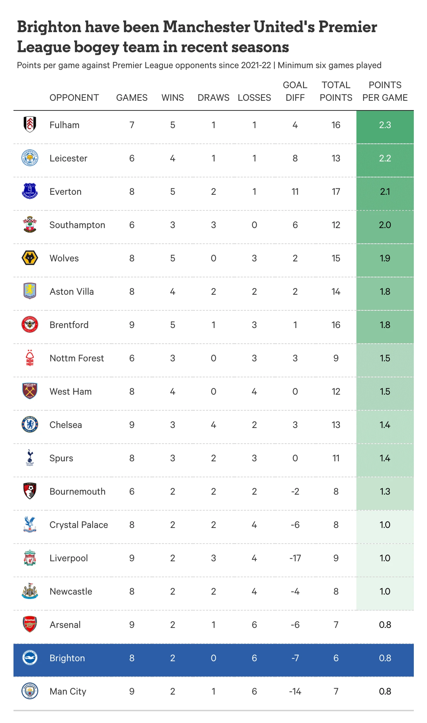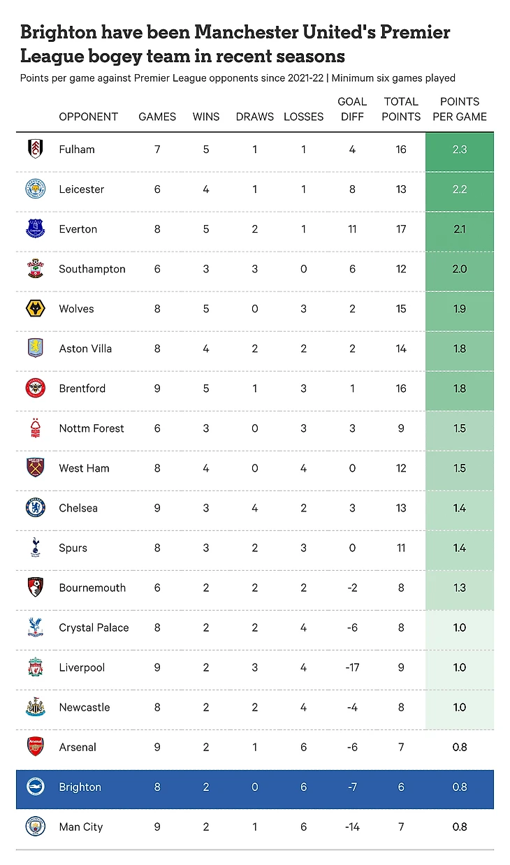 Если поначалу, после выхода «Брайтона» в Премьер-лигу в 2017 году, «Юнайтед» доминировал в личных встречах, то в последние годы ситуация изменилась. По итогам последних четырёх сезонов ни одна команда не имеет лучших результатов в матчах с «Манчестер Юнайтед», как дома, так и на выезде.
