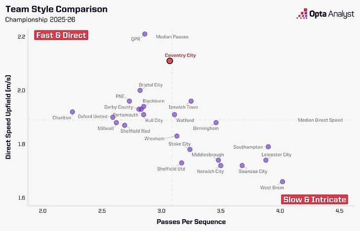 В нынешнем сезоне только «КПР» (2.2 м/с) опережает «Ковентри» (2.1 м/с) по скорости продвижения мяча в атаке. Как видно на следующем графике, команда тратит на перепасовки меньше времени, чем большинство коллективов Чемпионшипа.