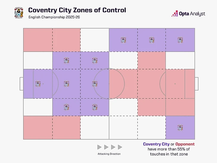 Впрочем, Лэмпард не является сторонником одержимости владением мячом. «Ковентри» в среднем контролирует лишь 52.3% владения, занимая по этому показателю далеко не лидирующие позиции: