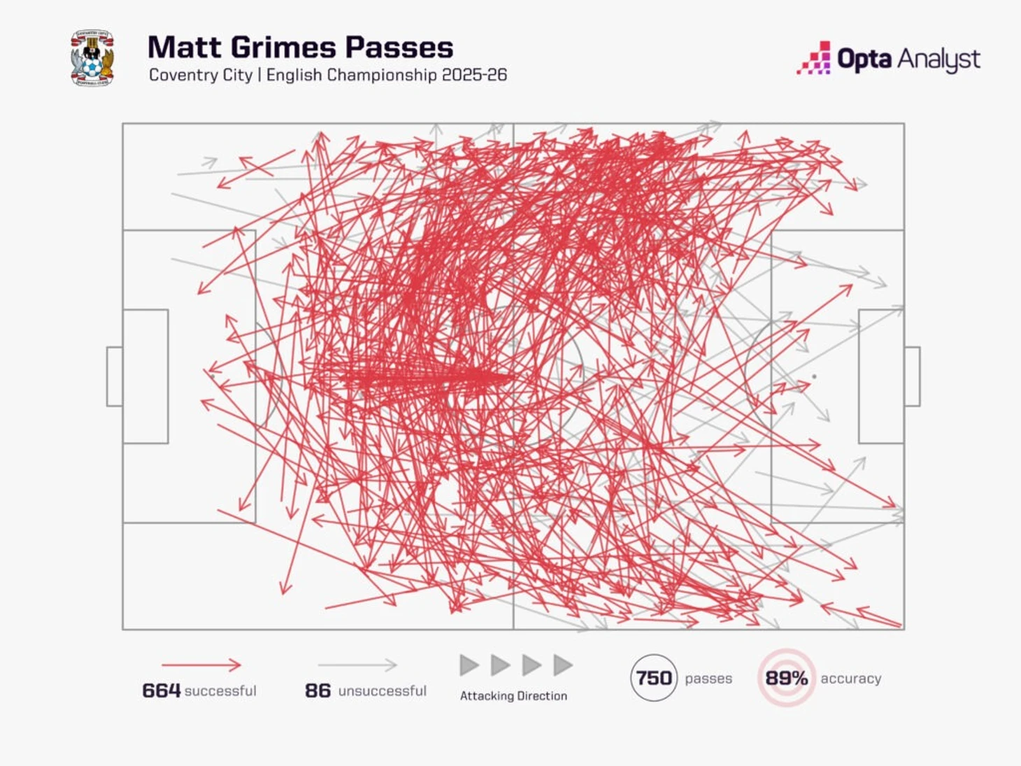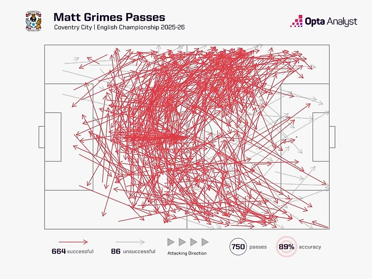 Помимо этого, Граймс сочетает уверенное владение мячом с исключительным чтением игры и умением отбирать. В сезоне 2025/26 именно он чаще любого другого игрока Чемпионшипа (19 раз) возвращал владение, запуская атакующую комбинацию, завершавшуюся ударом.