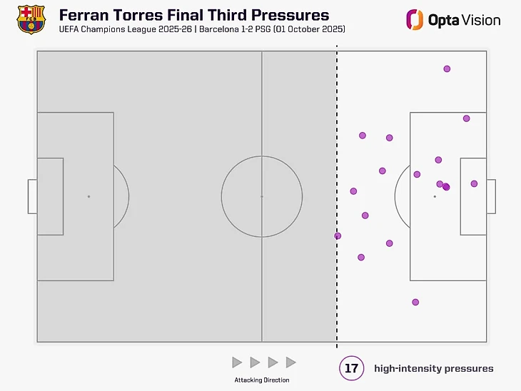 В первом крупном испытании нового сезона — поражении от «ПСЖ» (2:1) в Лиге чемпионов — Торрес вышел в основе вместо Левандовски и оправдал это решение именно той игрой, которая была нужна команде, даже если результат оказался не в их пользу. Его 37 выходов на высокий прессинг стали лучшим показателем среди всех нападающих «Барселоны» в Лиге чемпионов в текущем сезоне.